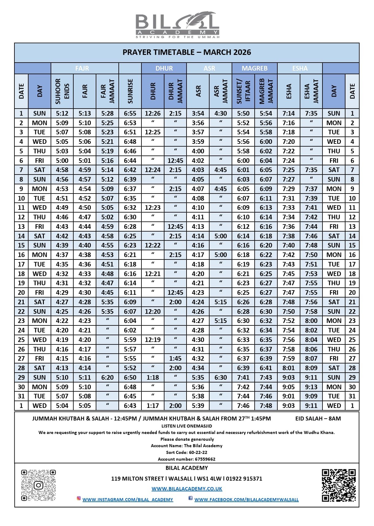 Bilal Academy is a charity organisation based in the heart of Walsall, established in 2003 under the guidance of the Senior Ustadh of Hadith at Darul Uloom Bury, Hazrat Maulana Bilal Saheb DB, to cater for the needs of the whole community.